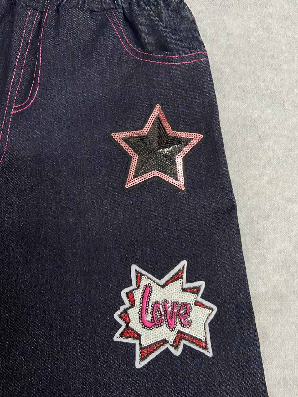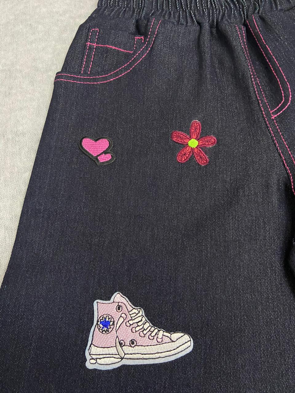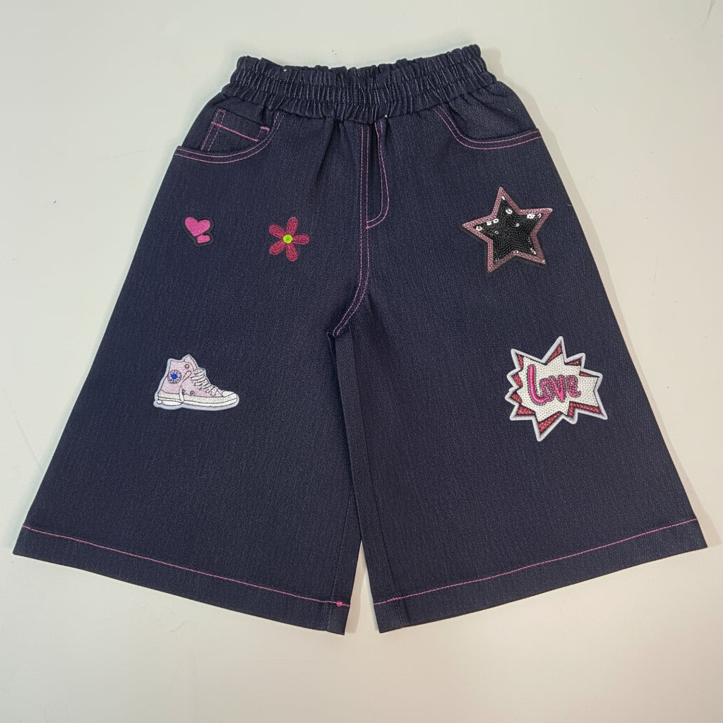 Make a statement with this uniquely designed dark-wash denim jorts with stickers and flared bottoms allowing comfortability.